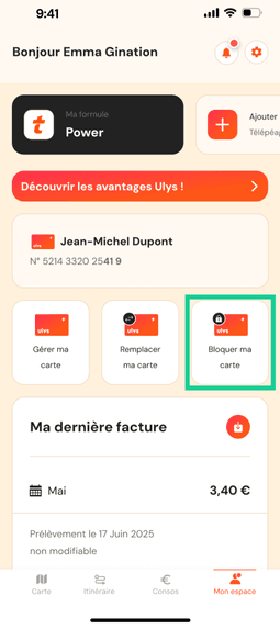 Depuis l’app Ulys onglet « Mon espace », appuyez sur « Bloquer ma carte ». Vous pouvez ainsi déclarer la perte ou le vol de votre carte de recharge qui sera immédiatement désactivée. Vous pouvez également désactiver votre carte de recharge sur le site ulys.com.