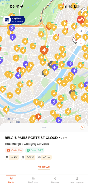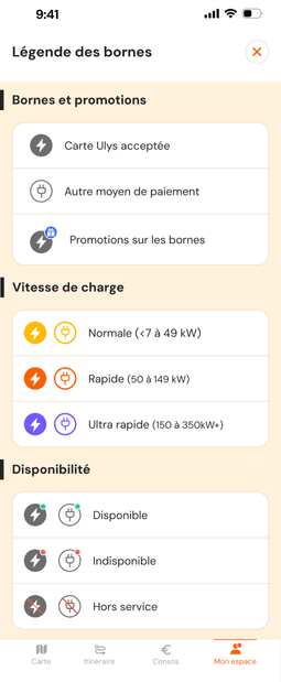 Les sigles avec le symbole⚡vous confirment que la carte de recharge Power est acceptée. Vous pouvez également voir le statut, libre, occupée ou hors service, des bornes présentes sur le point de recharge sélectionné.